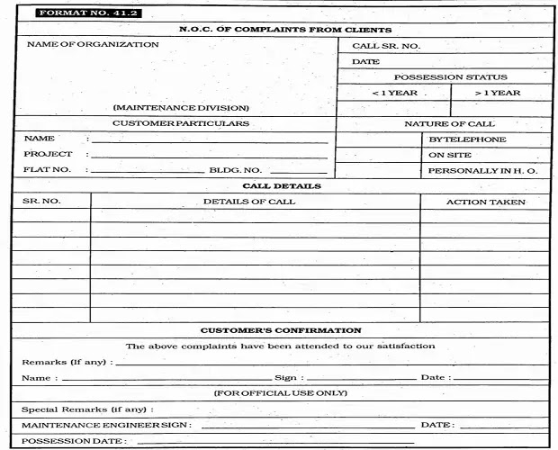 - After satisfactory completion of the job, the maintenance supervisor should take the N.O.C. from the client on the standard N.O.C. format.