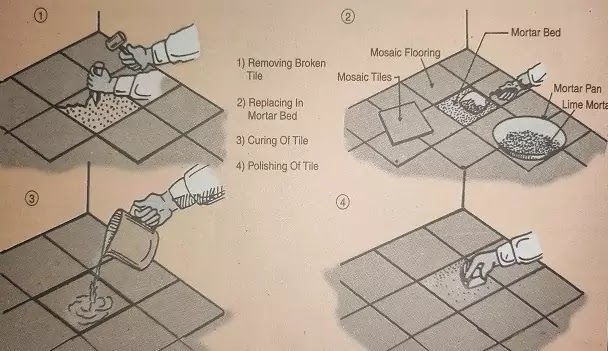 Broken mosaic tiles during polishing of the flooring should be repaired before further polishing, as specified below.