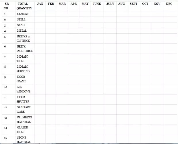 - Later, referring to the building planning and Construction activities completion chart, the month-wise requirement of each material can be worked out.