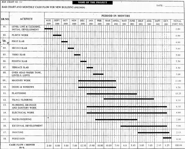 - The building planning and Construction activities completion chart gives an idea of the activities in a particular month/ period if the vertical column of time is referred to.