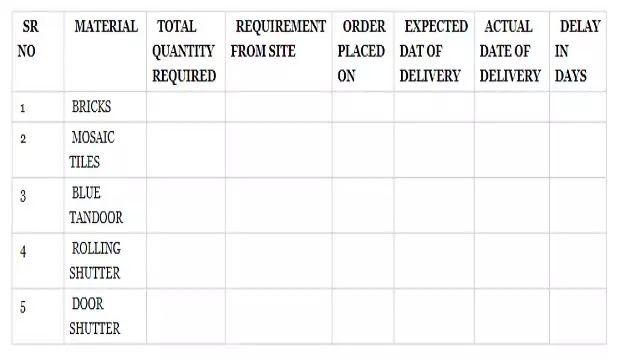 - Since the delivery dates and quantities of all the materials required are mentioned in the material order and receipt schedule, unnecessary congestion of working spaces is also avoided at the site.