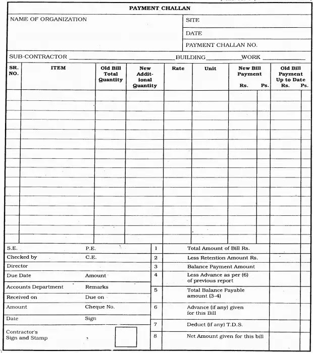 - Write down the name of the site, date, bill number. name of the subcontractor on each measurement sheet and payment challan.